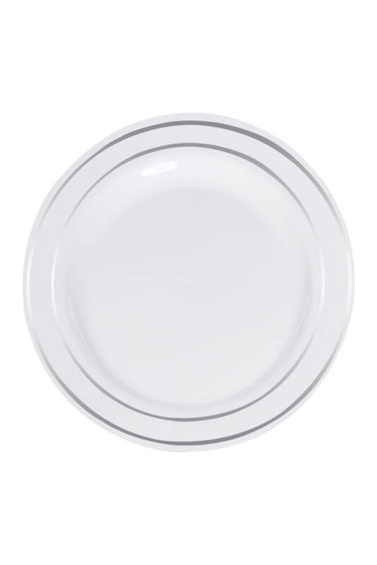 26cm çapında, geniş, porselen görünümlü lüks plastik tabak. Gümüş çerçeveli, büyük, dayanıklı plastik tabak davet ve organizasyonlarınız için şık bir prezantasyon sağlar.Parti ve Doğum Günlerinize renk katın.Materyal:Plastik, Paket: 6 Adet,Parti,Doğum Günü ürünleri